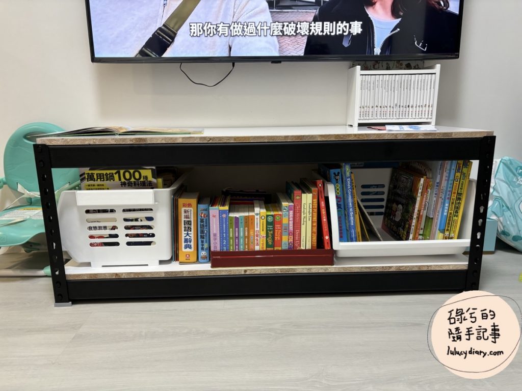 但是從圖片中可以看出來,我們家的童書已經把櫃子塞爆,而且還有很多散落在家裡各個角落的書本,剛好看到空間特工看到這款電視櫃,高度在電視之下,雖然比較深一些,但是寬度較寬,可以放更多東西,因為上述我們對於家具的選購考量點,再加上目前角鋼衣櫃的購買經驗和使用經驗都還不錯,因此決定再添加一組角鋼電視櫃,也提供以下資訊給需要的朋友: