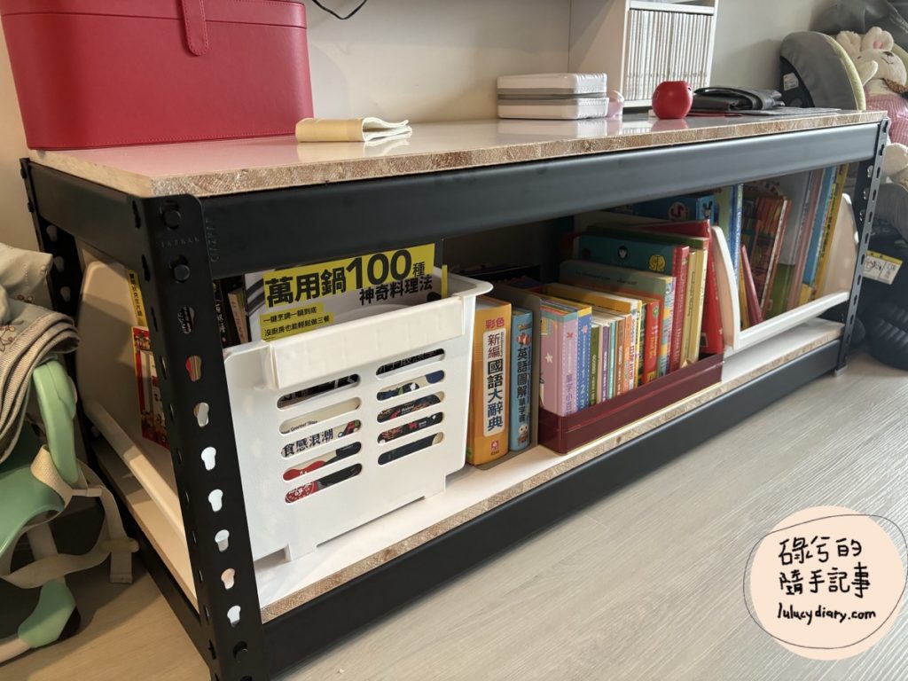 登登登登~登登登登~免螺絲角鋼電視櫃正式開工!因為目前這個位置是擺放糯米的童書們的地方,童書有大有小的,直接放進去應該會倒的歪七扭八,所以組完電視櫃的隔天我們就殺去宜得利買一些收納櫃,整理起來還蠻有模有樣的嘛!
