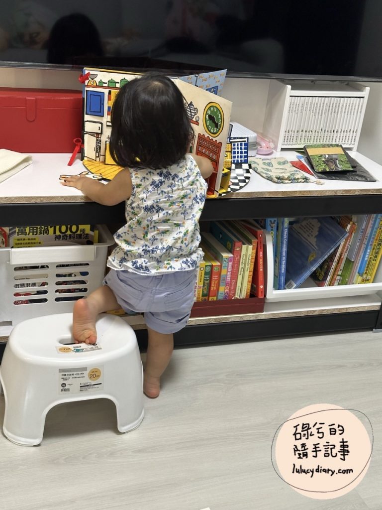組裝玩的第二天就已經變成我們家糯米的小書桌台,糯米會自己搬椅子和書本或玩具在電視櫃上面看書或玩玩具。