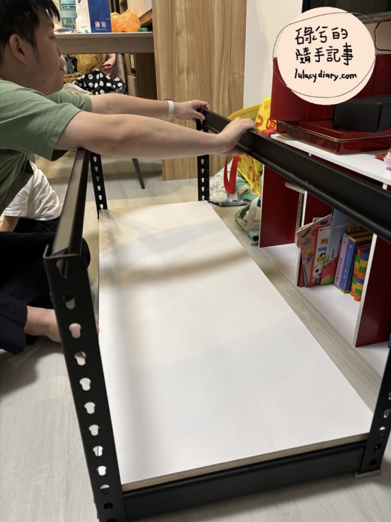 組裝容易這點也是我們選擇的重要因素,免螺絲角鋼的垂直支柱有整排的孔洞,搭配水平角鋼末端的鈕扣設計,讓支架間穩固的扣在一起,負擔大重量時也會使鈕扣更緊的扣住。免螺絲角鋼的組裝簡易到我這個組裝笨蛋一個人都能完成,更何況是我們J弟三兩下就組好了,雖然組裝的過程中有一隻不受控的幼童在旁邊跑來跑去,不過沒有螺絲,而且除了長面有固定的插銷(?)之外,真的沒有額外零件,相當方便。
