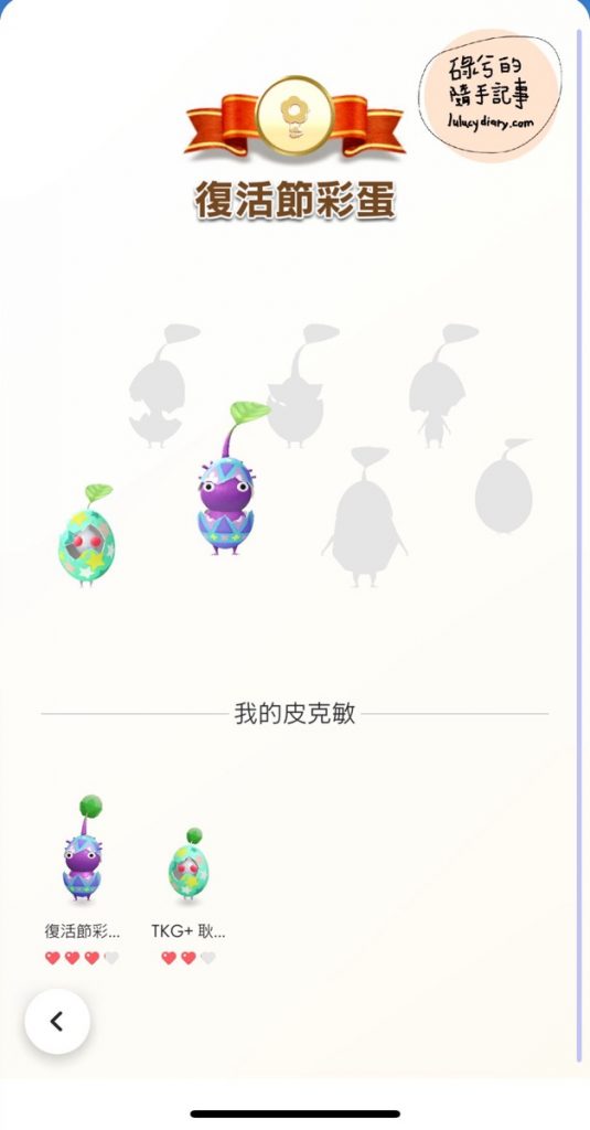 更多關於花苗或皮克敏右後放圖示的說明可以看這邊文章: [Pikmin Bloom] 蒐集皮克敏飾品圖鑑你需要知道的小技巧之1: 皮克敏/花苗背景的圖片顏色