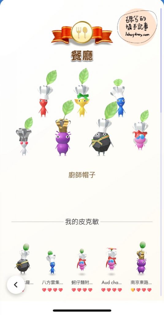 餐廳圖鑑的皮克敏攜帶的配飾是廚師帽子,戴白色廚師帽的皮克敏們有種料理鼠王的感覺,而且白色皮克敏帶的是銀色的廚師帽,紫色皮克敏帶的是金色的廚師帽。