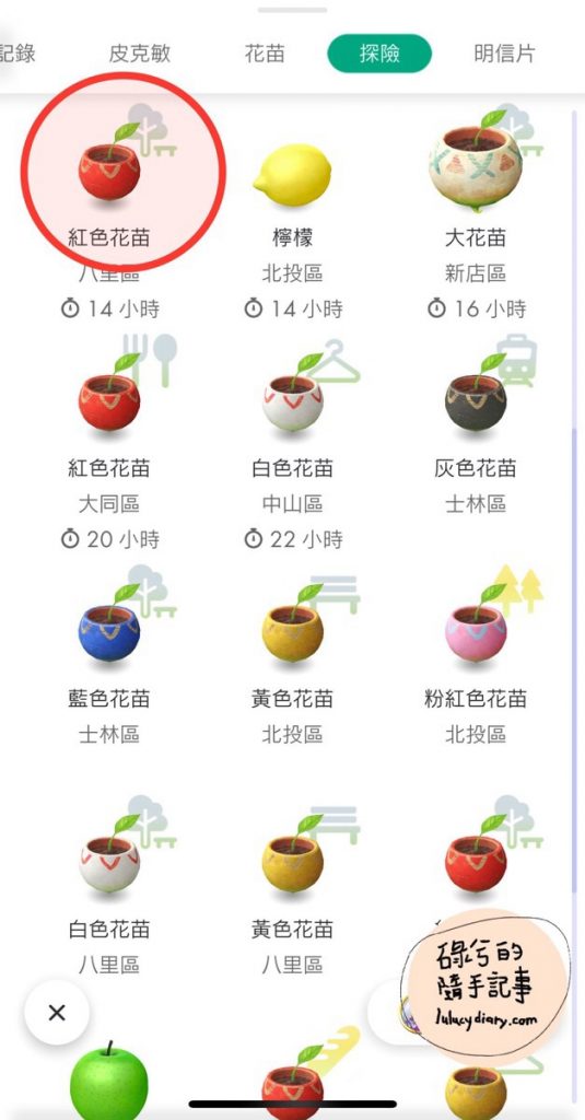 取得花苗的地方會取決於皮克敏攜帶的飾品,在探險的畫面都可以看到該花苗是哪個圖鑑/飾品類別唷!下圖的案例,紅色圈圈就是會攜帶「路邊」飾品的紅色皮克敏,但是剛拔出會是一隻0顆愛心的皮克敏,要培養到4顆紅色愛心才會回到取得花苗的地方拿回飾品。