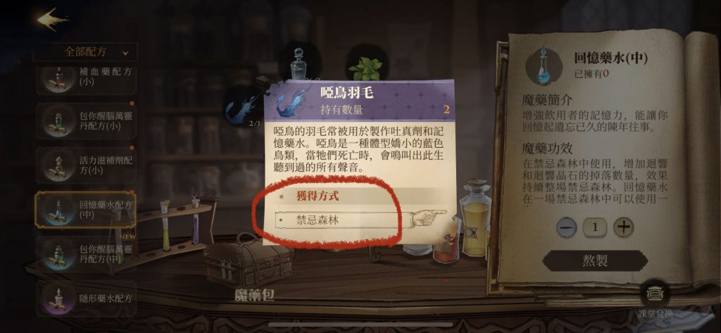 在點選魔藥材料的時候,可以看到獲得方式,大多數的魔藥材料可以在課堂購買,但是也不乏一些需要在禁忌森林才可獲得的魔藥材料。