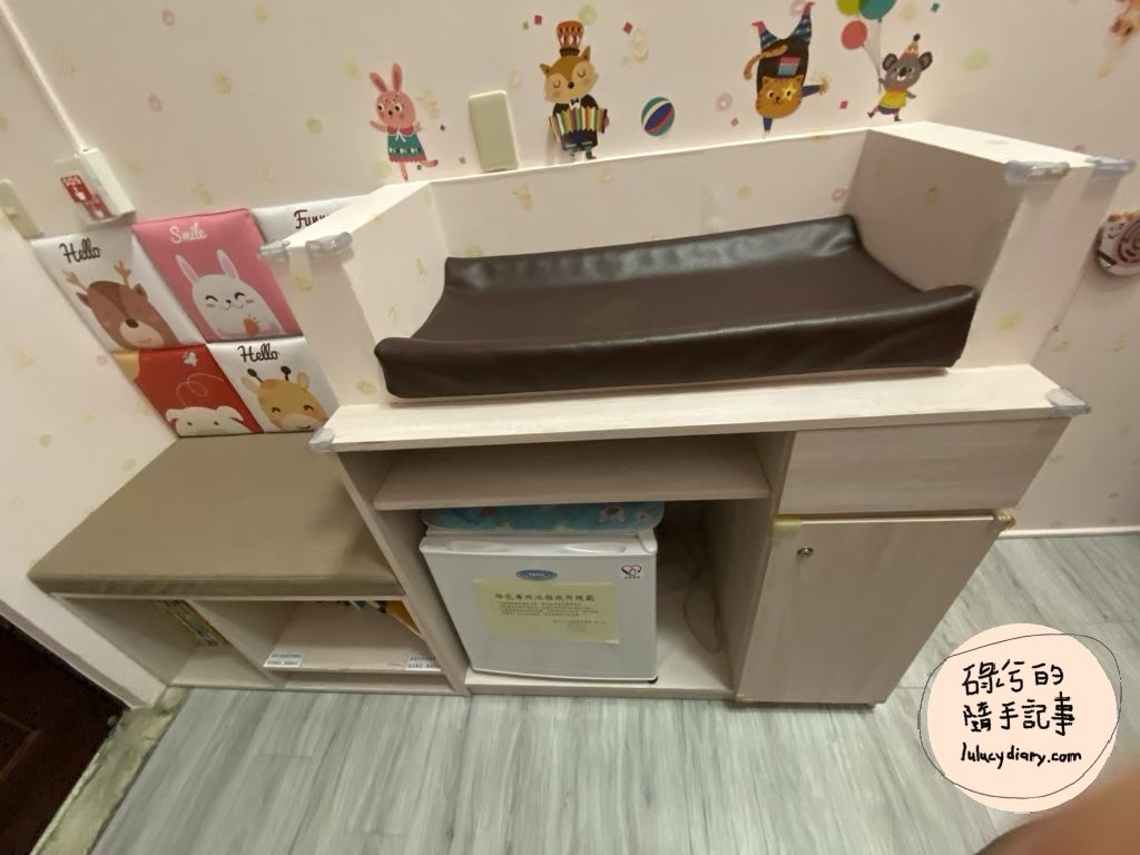 在尿布台的下方有母乳專用冰箱,而哺乳專用冰箱的左邊還有一些書籍,應該是媽媽在哺乳的時候,可以讓較大的小朋友看書打發時間用的。