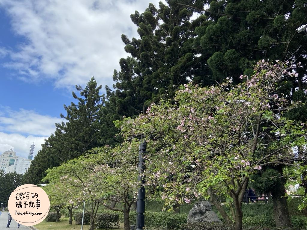 這次我們是繞著中正紀念堂主堂體走一圈,對櫻花不瞭解的兩個人,只能用顏色來辨識…日本櫻花區的櫻花是桃紅色的,而原生櫻花區的櫻花則是粉色的。