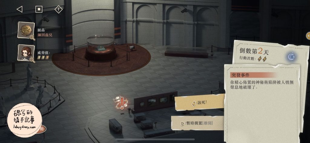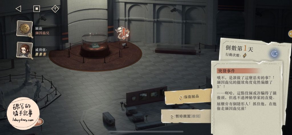 突發事件:哦不,是誰做了這麼惡劣的事?!緬因齒兒的擺放角度竞然偏離了5° !……啊哈,這點伎倆或許騙得了攝像頭,但逃不過神秘學家的直覺。展櫃旁有個隱形人!抓住他,在他偷走緬因齒兒前!- 過期事件:保衛展品 -> 評價+10