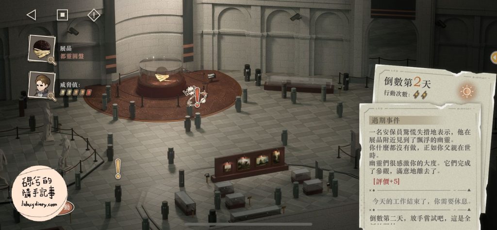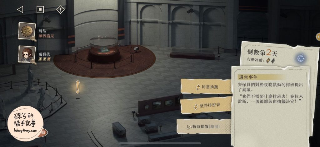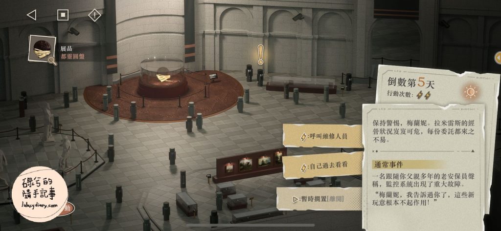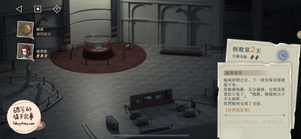 通常事件:一個女人正在對展品拍照。安保員對她發出了警告,並要求她交出底片。“這是拉米雷斯的規矩。“女人十分慌張。“很抱歉,我實在是太喜歡這些奇特的古董……至少,能讓我留下底片嗎?就一張?“- 拒絕請求 -> 評價+5