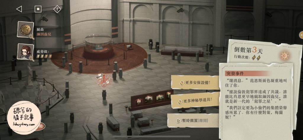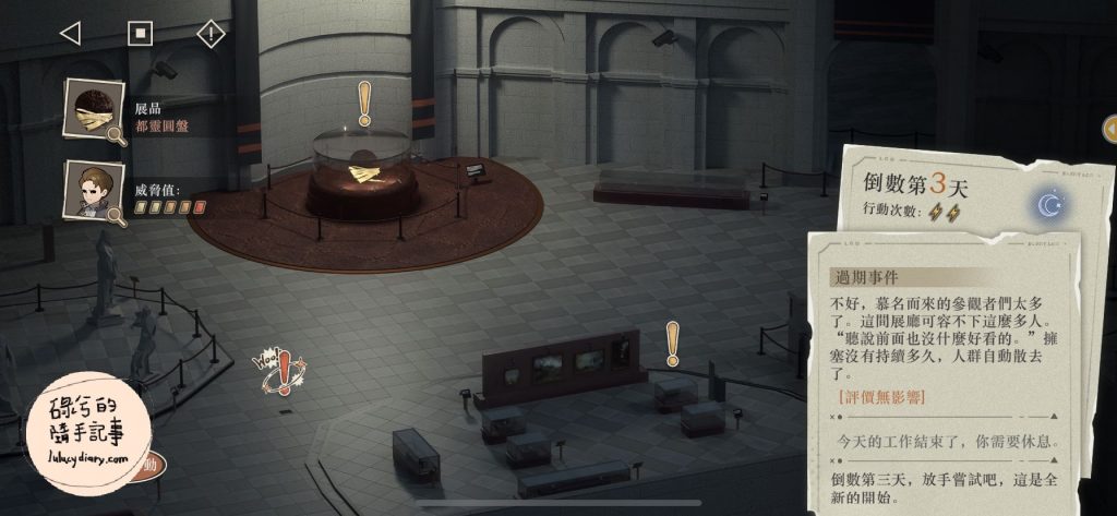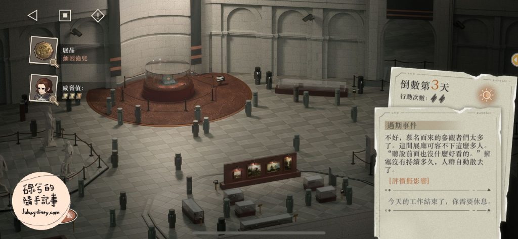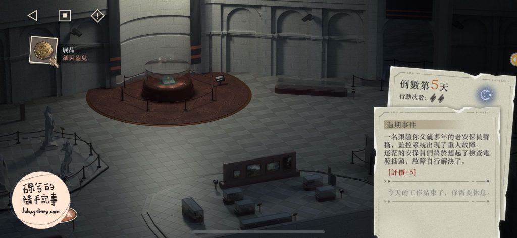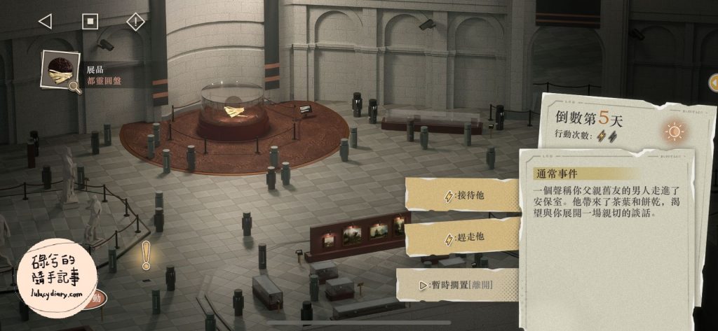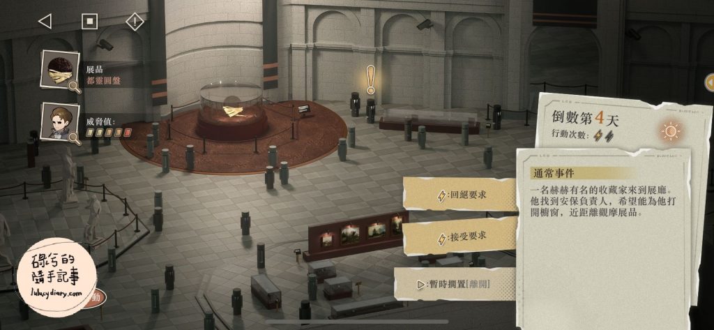 通常事件:一名赫赫有名的收藏家來到展廳。他找到安保負責人,希望能為他打開櫥窗,近距離觀摩展品。- 回絕要求 -> 評價+5