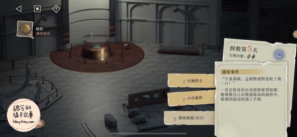 通常事件:“千真萬確,這硬幣絕對是咬了我一口!“一名安保員向拉米雷斯索要賠償。他聲稱自己在搬運展品的過程中,讓緬因齒兒咬傷了手指。- 安撫對方 -> 評價+10