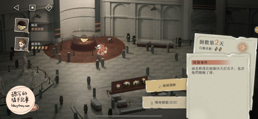 突發事件:兩名醉漢在展廳內大打出手,也許他們剛輸了球。- 強制調解 -> 評價+5