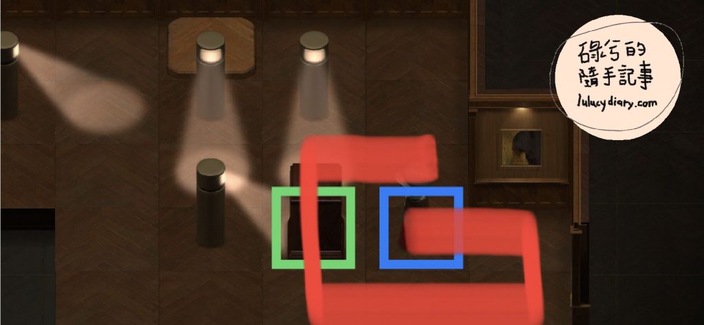 - 依照第二張圖,避開探眼繞至展櫃的右方,將展櫃向左推一格