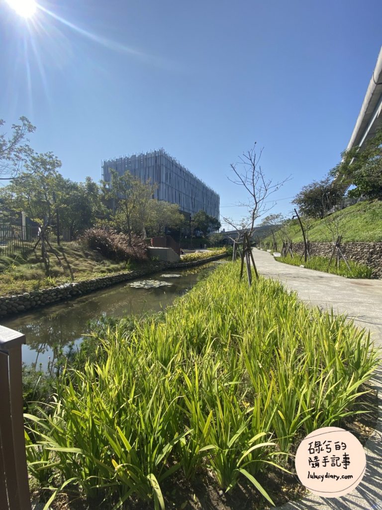 經過戲水沙坑,我們沿著館前路(藝術大道)平行的小路朝美術館方向前進,可以看到人造的小溪流,旁邊充滿了綠意盎然的植物,而且可以看到完整的新北市美術館。