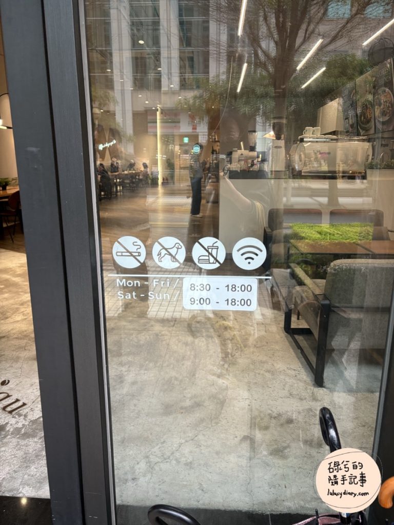 大片的玻璃門上面有貼營業時間以及禁菸、禁止寵物、禁帶外食跟供應WiFI