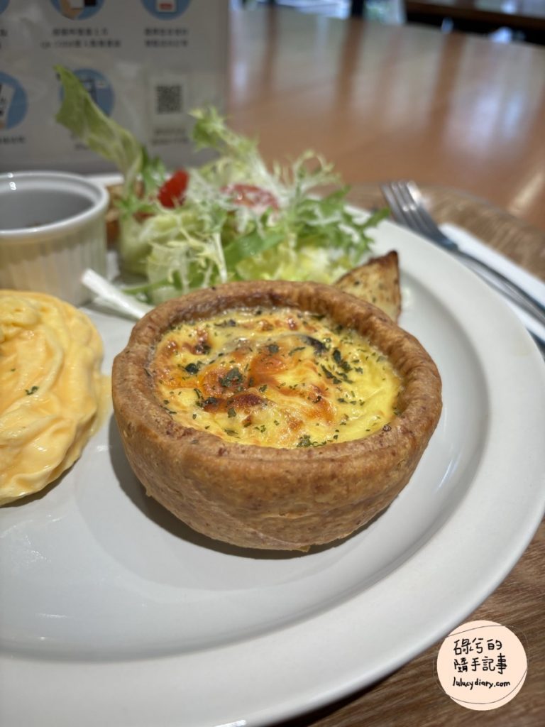 我點的義式白松露奶油野菇鹹派早午餐有一些沙拉佐油醋醬、馬鈴薯塊2塊、炒蛋以及主角鹹派。