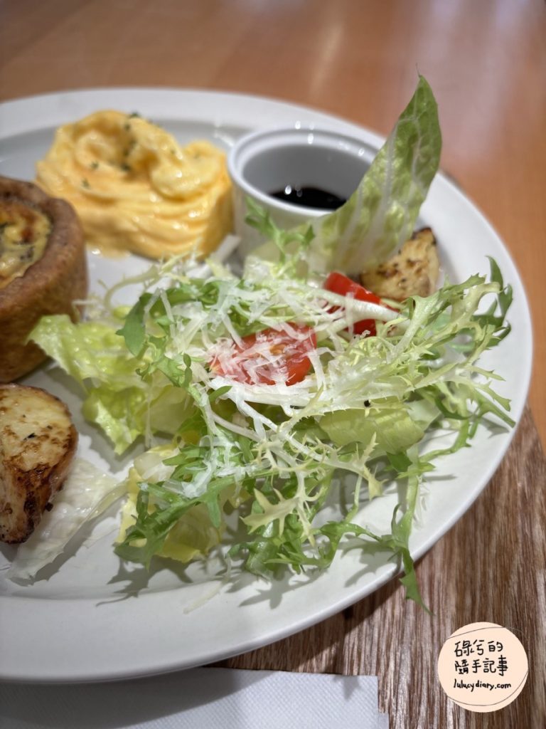 沙拉的份量不多不少,裡面還有切塊的小番茄,搭配油醋醬很清爽又開胃。