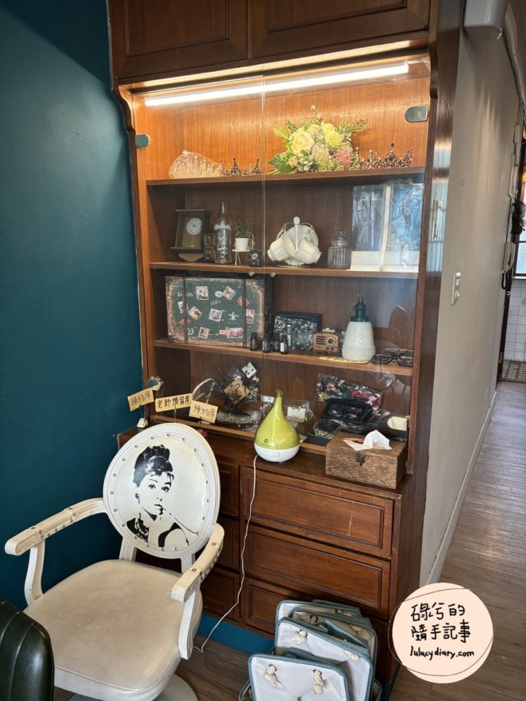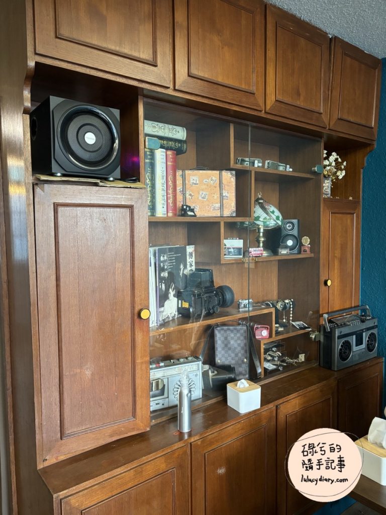 靠牆的兩側都是很復古的木製五斗櫃,放了一些復古的裝飾。