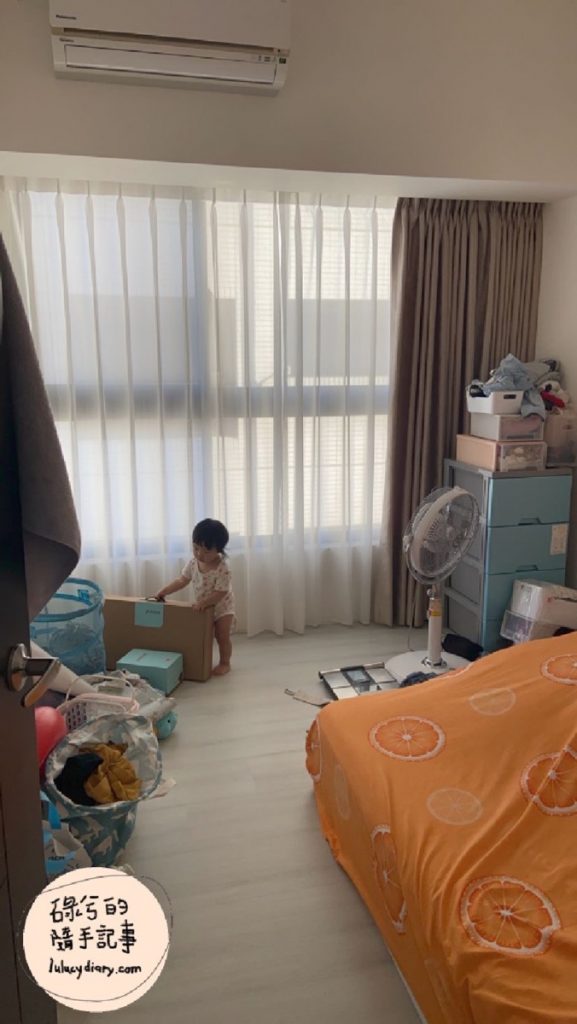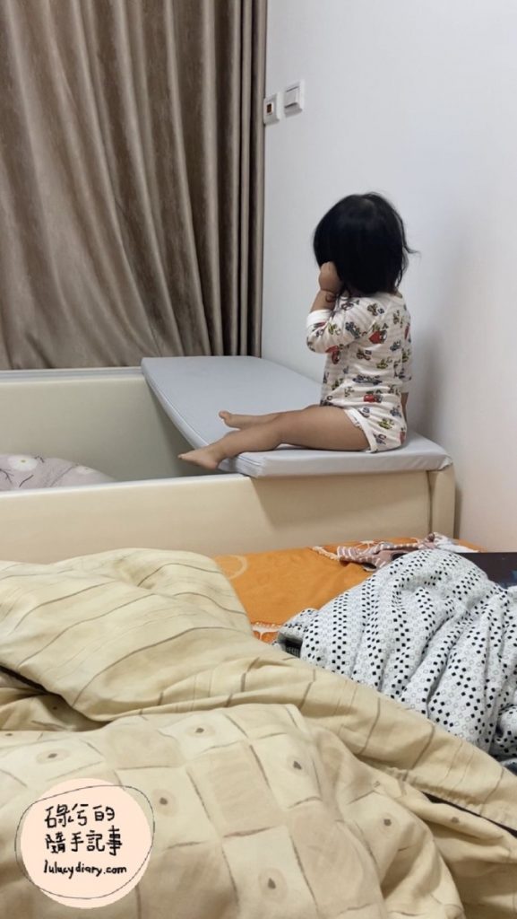 後來遇到我們搬家,Caraz城堡地墊也待在儲物間沉寂一陣子(整理房間真的太累了…),當初擔心糯米掉下床而不買床架,沒想到糯米還是能滾下床然後大哭。後來媽媽靈機一動,如果床下的空間放得下地墊的話,至少不會直接摔在地上,因此…城堡地店又重出江湖。