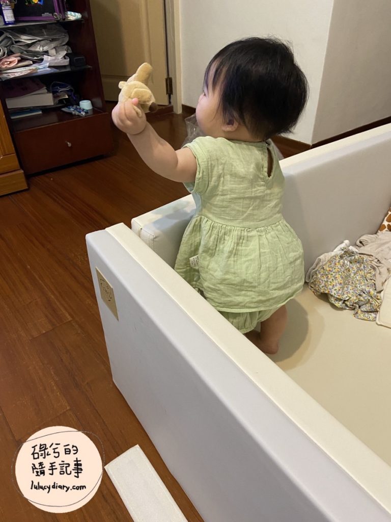 到大概11個月快12個月大的時候,我有索性把地墊收起來,因為糯米已經開始嘗試越獄,無論是把身體壓在圍牆上,或是練習跨欄,又或者踩著我的身體要爬出去;再者是天氣變熱,跟木地板相比,地墊的體感還是稍微熱一些。