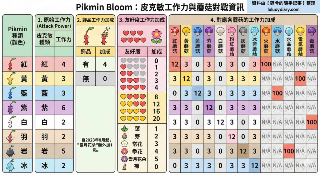 為了解決這些疑惑,特別幫大家把複雜的遊戲機制,整理成了這張「Pikmin Bloom 工作力與蘑菇對戰速查表」,只要看懂這張圖,你就能精準把資源花在刀口上!