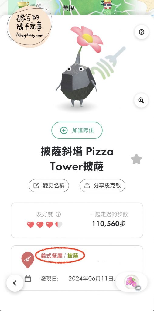 只要點進皮克敏的詳細畫面,系統會直接標示出子類別。例如點開義式餐廳的花苗,它會直接寫出「義式餐廳 / 披薩」或是「義式餐廳 / 義大利麵」。