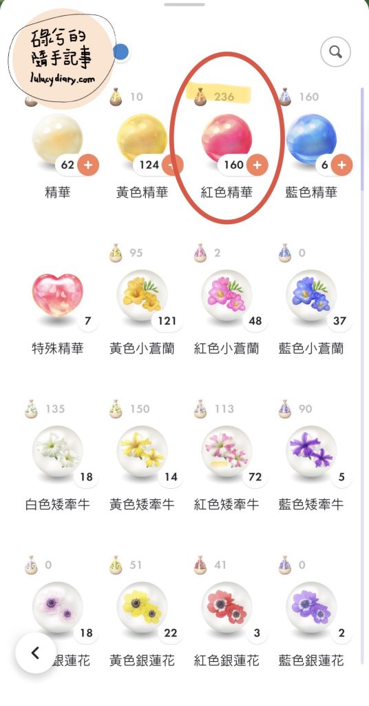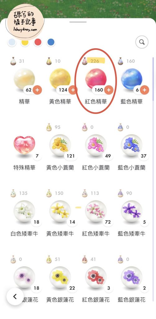 像我有時候紅色普通花瓣快用完了,我就會挑幾隻重複的皮克敏,餵牠們吃紅色精華開花,然後再野放。這是一口氣補充特定顏色花瓣的超棒技巧!