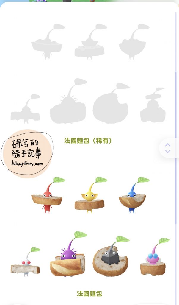 麵包店圖鑑的皮克敏攜帶的配飾是法國麵包,原本算是我唯三完成的圖鑑,一樣新增了稀有法國麵包…看來我離圖鑑大師之路又更遙遠了。